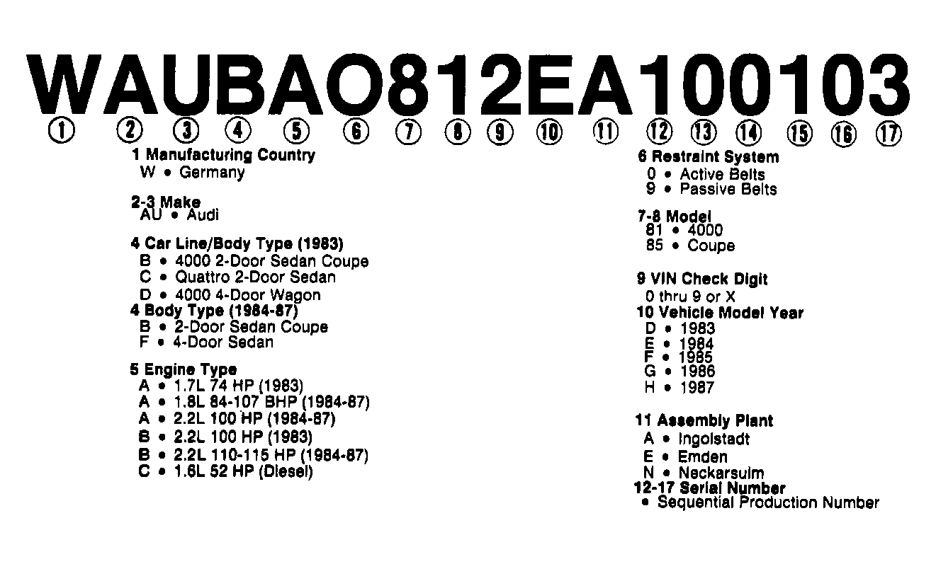 Home >> Audi >> 1985 >> Coupe Automatic >> Repair and Diagnosis >> Engine Performance >> Application >> Engine/VIN Id >> Model Identification >> VIN Code Id Explanation