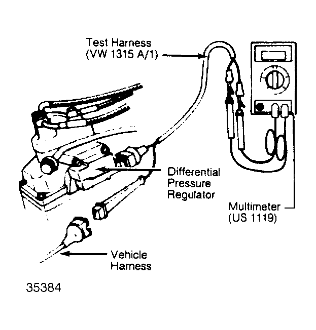 Connect test harness between differential pressure regulator and vehicle harness. See Fig 1 . Connect multimeter to test harness. Disconnect wiring from coolant temperature sensor and leave open. Turn ignition on. Differential pressure regulator current should be 80-110 mA. If not, replace ECU.