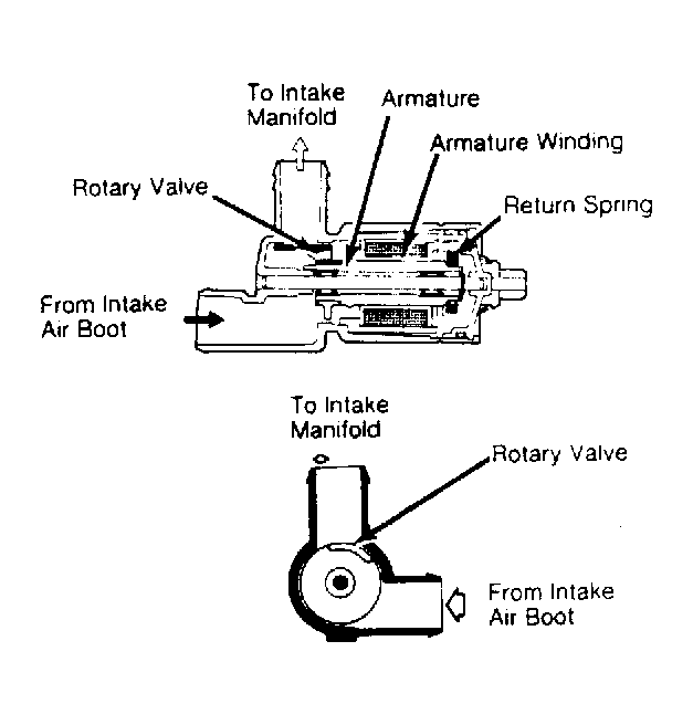 The amount of current will determine how far the rotary valve is rotated. See Fig 1 . When the rotary valve is rotated, air from the intake air boot to the intake manifold by-pass varies.