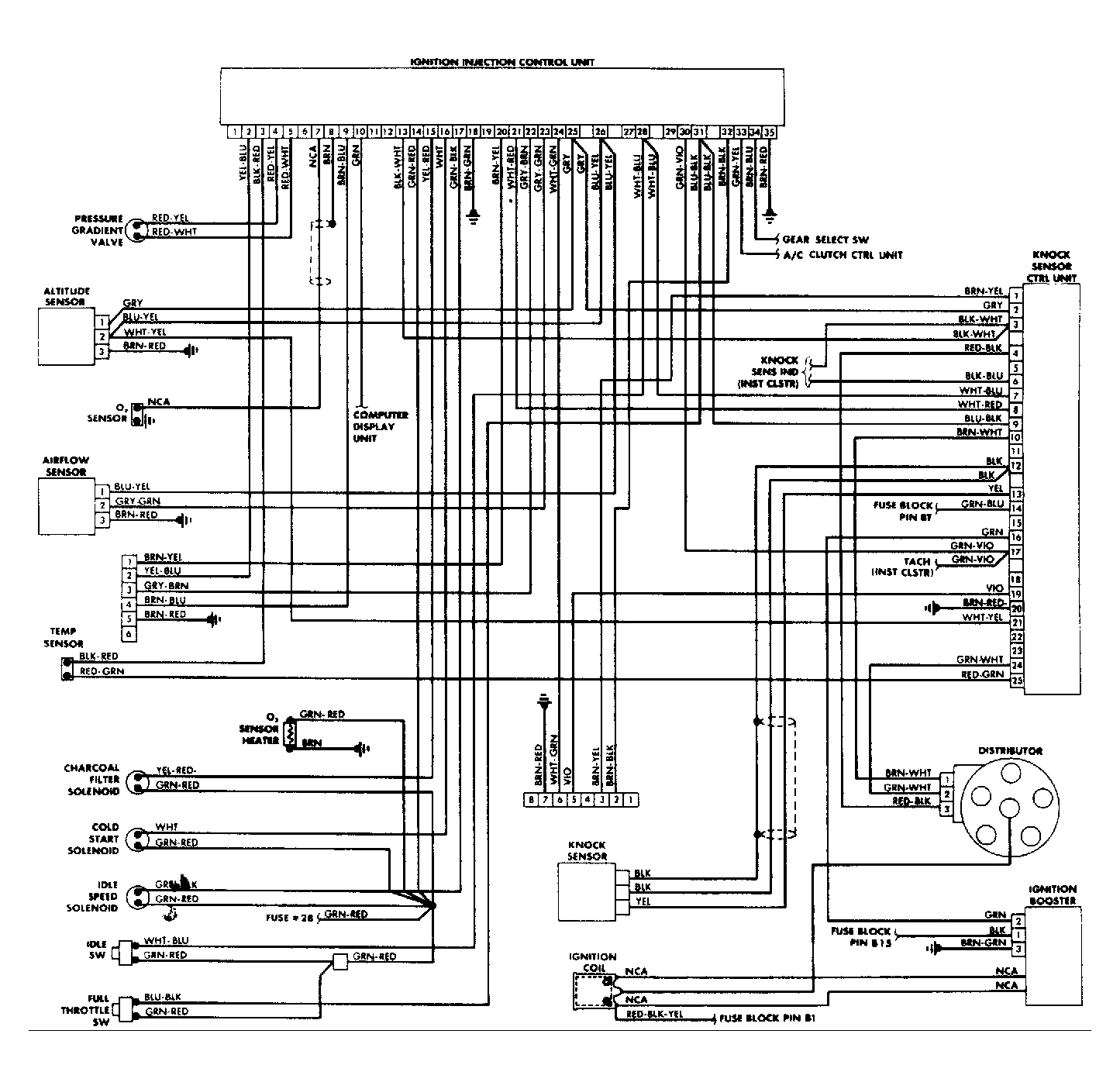 - Remove ICU cover from left side kick panel. Disconnect harness connector from ICU and Connector "D" from distributor. Check for continuity between distributor connector pins and appropriate 25-pin ICU connector pins. For correct pin-to-pin reference, see Fig 1