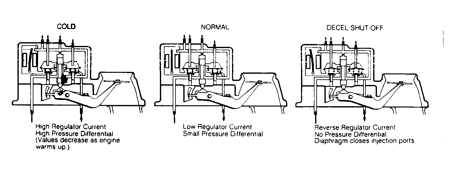 Differential pressure regulator is mounted on side of fuel distributor. An electrically operated plate valve combined with fixed outlet orifice, governs pressure in lower chamber. See Fig 1 . Pressure change in lower chamber causes movement of diaphragm and controls fuel volume flow to injectors.