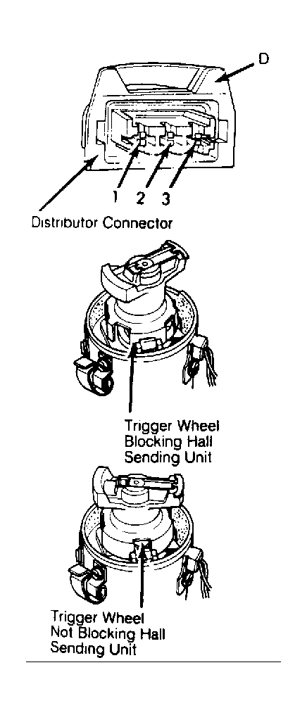 The Hall Effect sending unit in the distributor receives voltage from the knock control unit or directly from the electronic ignition control unit. A trigger wheel (shutter blades) mounted on the distributor shaft passes in and out of the air gap of the Hall Effect sending unit, resulting in signal pulses. See Figure. There is one trigger wheel shutter/window for each engine cylinder, except on Audi 5000CS Quattro and 5000CS Turbo, which have a single window to indicate cylinder No. 1 and additional sensors on the flywheel to indicate engine speed and TDC.