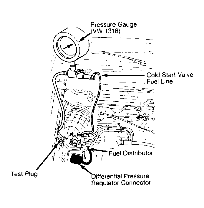 1. Using Adapter Fittings,connect Pressure Gauge (VW 1318) between line from fuel distributor to cold start valve and test port connection on lower chamber of fuel distributor. See Figure . Test port is sealed by a threaded plug. Bridge fuel pump relay (located on fuse/relay panel) with Jumper Switch (US 4480/3). See Figure for fuel pump relay terminal identifications.