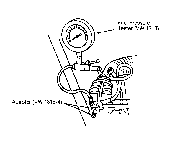 - Ensure engine is at normal operating temperature. Connect Fuel Pressure Tester (VW 1318) to fuel distributor using Adapter (VW 1318/4). Close fuel pressure valve. See Fig 1