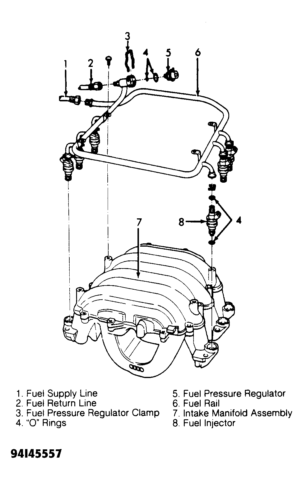 Disconnect negative battery cable. Disconnect fuel lines from fuel supply manifold. Remove fuel rail mounting bolts and lift fuel rail with injectors. Remove injectors from fuel rail. See Fig 1 . To install, reverse removal procedure.