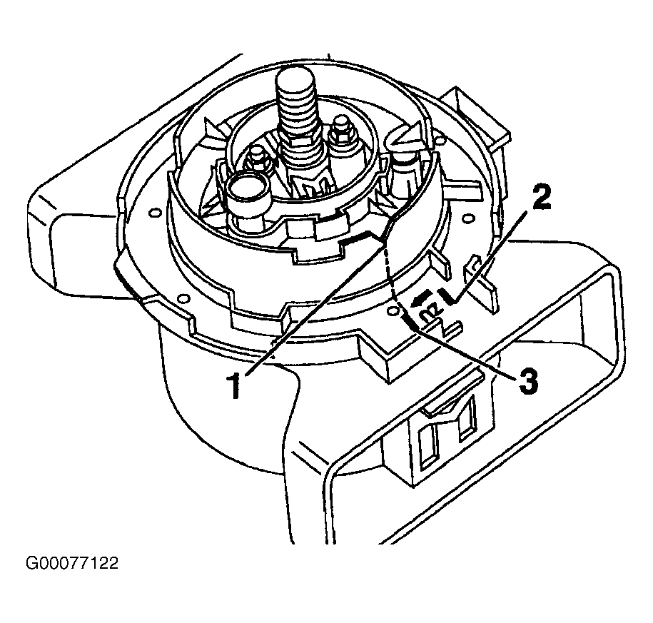 . When installing inner housing an audible click should be heard when housing is seated. Using fuel pump wrench turn inner housing about .59" (15 mm) to the right. Notch (1) on inner housing should now match mark (3) on outer housing.