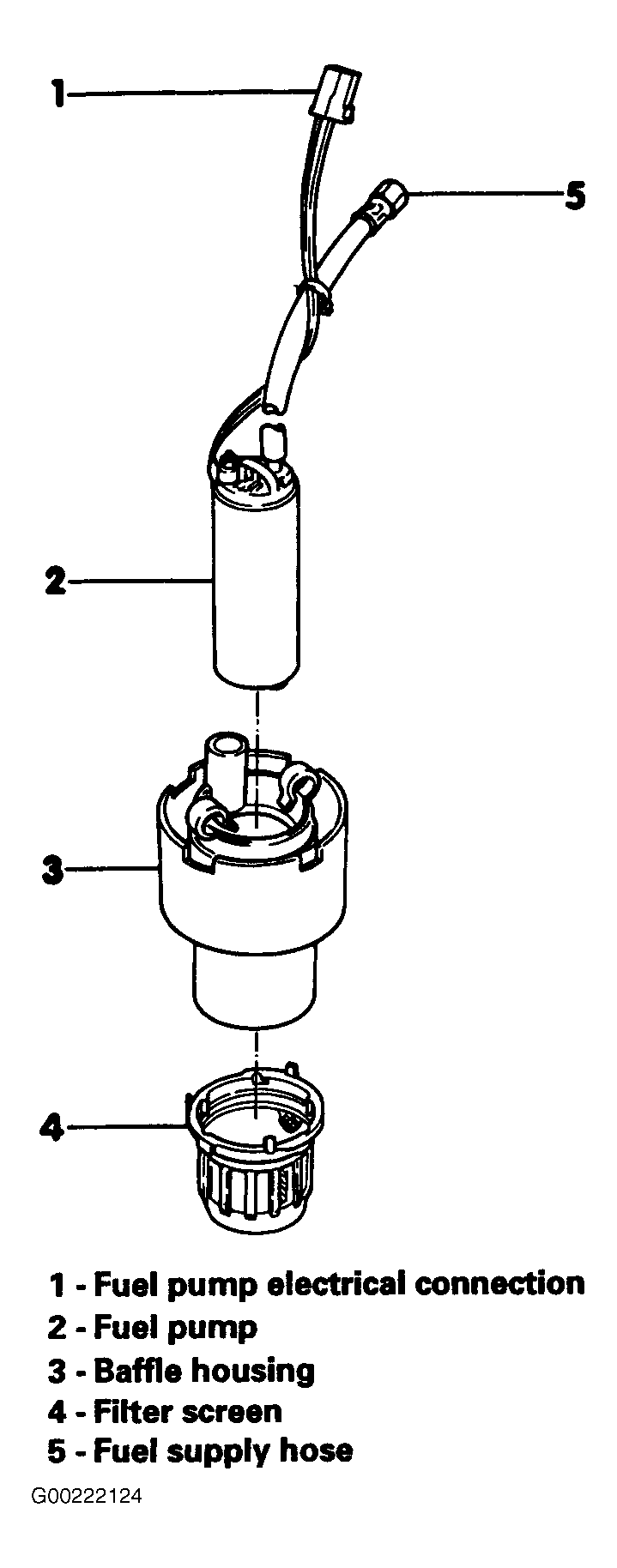 - Remove supply line from fuel pump. Remove power and ground wires from fuel pump. Fuel pump baffle housing come in 2 different versions. Type 1 uses a bayonet style fitting for filter screen, type 2 uses a welded filter screen. Ensure that appropriate style baffle housing is fitted. See Fig 3