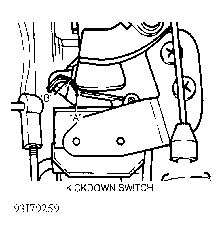 2. Slowly depress accelerator pedal. Kickdown switch resistance should go to zero ohms (continuity) in range "A" and "B". See Fig 1 . If continuity does not occur, loosen kickdown switch mounting bolts and move throttle lever by hand to wide open throttle position. See Fig 2 and Fig 3 .