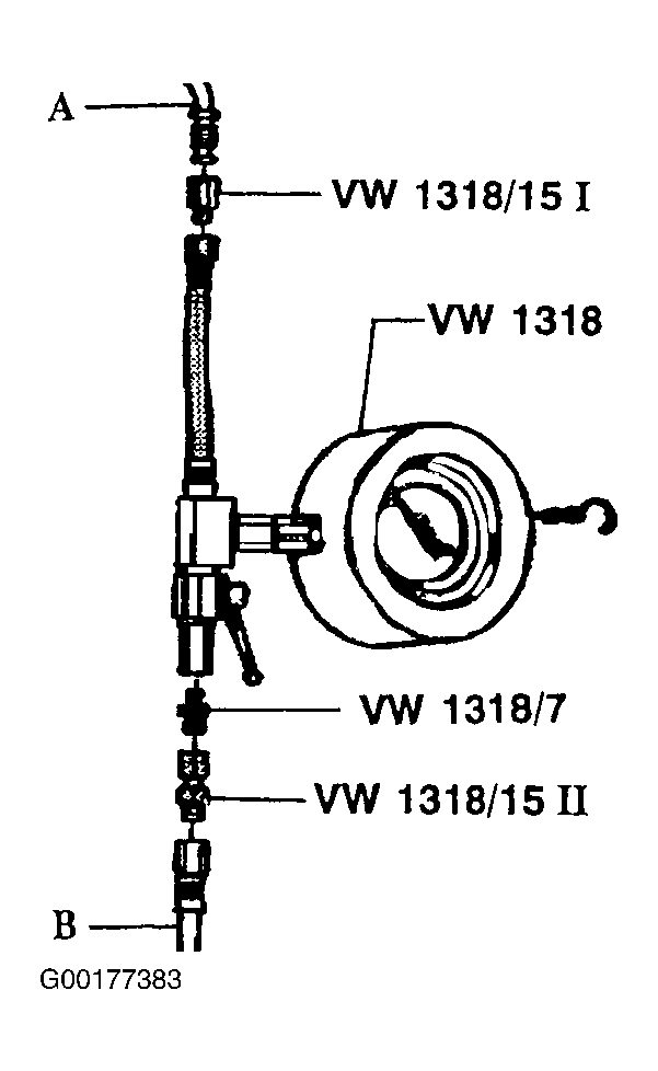 - Connect pressure gauge (VW 1318) into fuel supply line between (A) Fuel supply line from tank and (B) Fuel line to fuel rail. Use adapters (VW 1318/7 and VW 1318/15). Pressure gauge shut-off valve must be in the "OPEN" position (lever in direction of flow). See Figure .