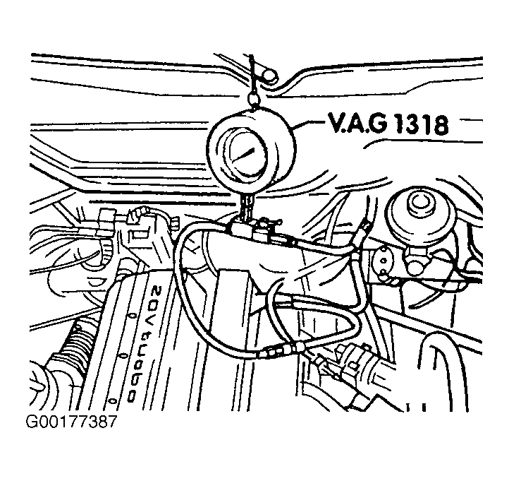 - Connect pressure gauge (VAG 1318) between fuel supply and fuel collector pipes with adapter (VAG 1318/1 1), (VAG 1318/13) and (VAG 1318/15). See Fig 1 . Lever to pressure gauge in "OPEN"position.