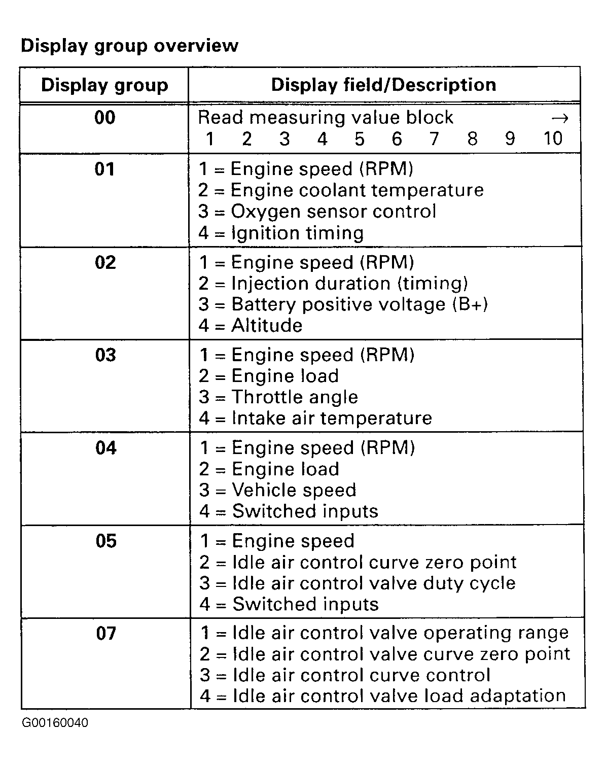 Measuring block values are displayed in 10 display fields (display group 00) or in four display fields (display groups 01 to 09). When the four display group display is shown, the physical units such as RPM or coolant temperature are also displayed.