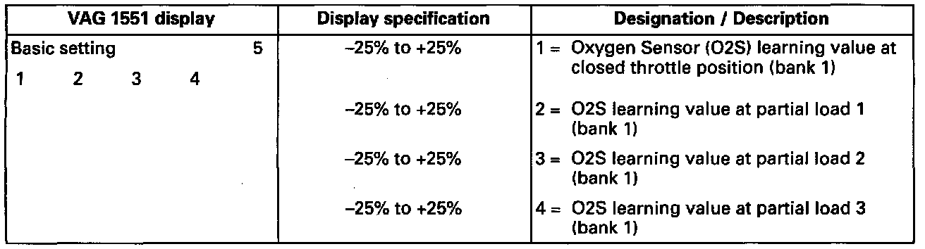 ^ If a 9% difference exists between the richest and leanest 02S learning values of one display group, the continued learning of the two affected learning ranges (see display groups 007 and/or 008) has stopped. The learning requirement display (see display groups 007 and/or 008) of these learning ranges cannot be 1.