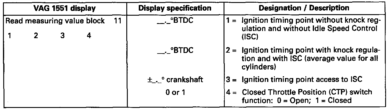 ^ Ignition timing point access to idle speed control during "Read Measuring Value Block" function 08 at idle (CTP closed) without electrical consumers on is 0.0 ± 3.0° crankshaft.