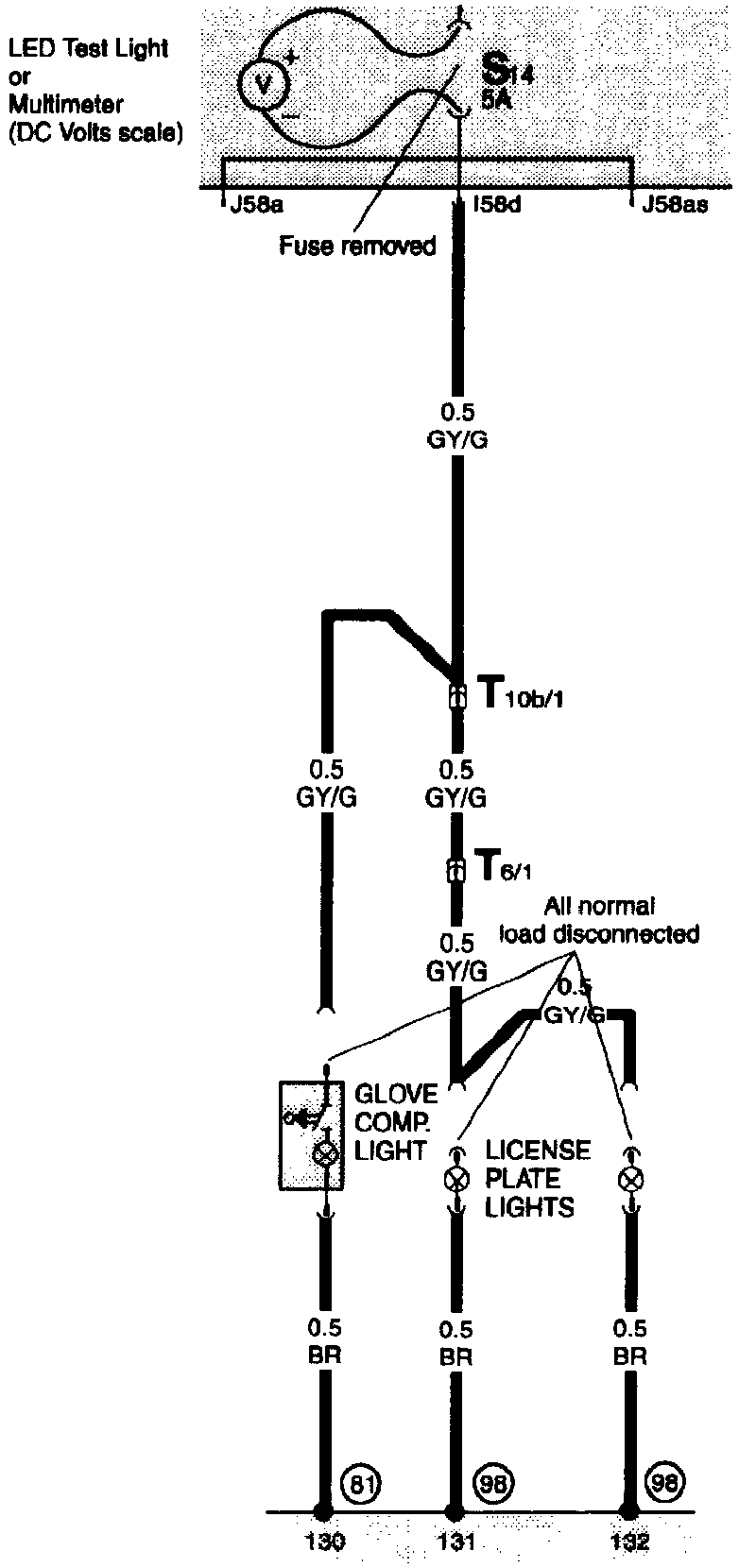The example used here is a short that is causing a blown fuse in the circuit powering the license plate lights and the glove compartment light.