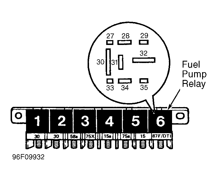 - Using a DVOM, check resistance between fuel pump relay connector terminal No. 29 and test box socket A5. Maximum resistance is one ohm. If resistance is within specification, replace faulty Powertrain Control Module (PCM). If resistance is not within specification, repair open circuit as necessary. See WIRING DIAGRAMS section.