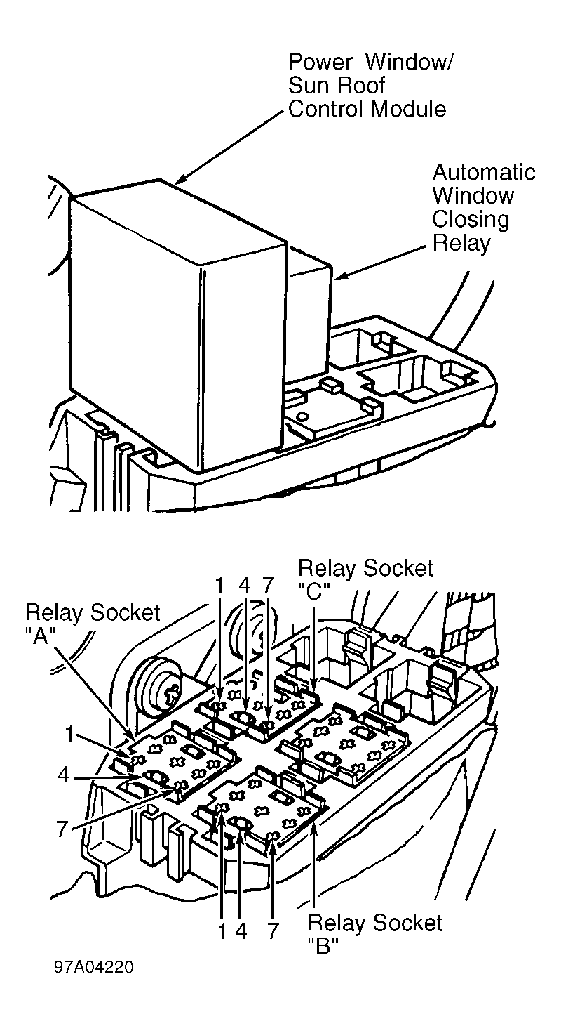 - Check resistance between ground and terminal No. 5 at relay socket "B". Continuity should exist with driver's door open and should not exist with driver's door closed. If continuity is as specified, replace power window/sun roof control module. If continuity is not as specified, check door switch. If door switch is okay, repair wiring. See WIRING DIAGRAMS.