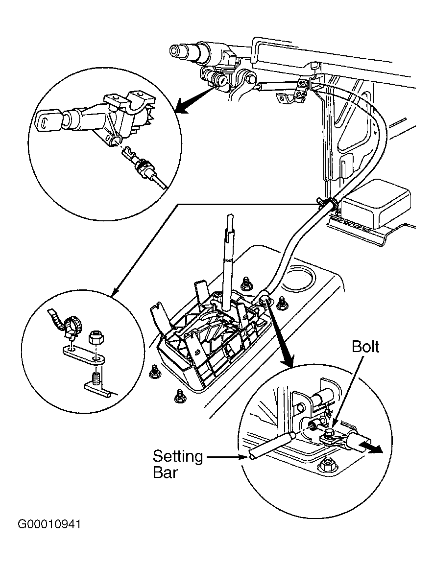 Loosen lock bolt at shifter. See Figure . Move gear selector to Park position. Put Setting Bar (3352A) between lever and interlock cable. Pull cable to remove slack. Tighten bolt and remove setting bar. Turn ignition off and on several times and recheck gap. Install cable housing to gear selector console.