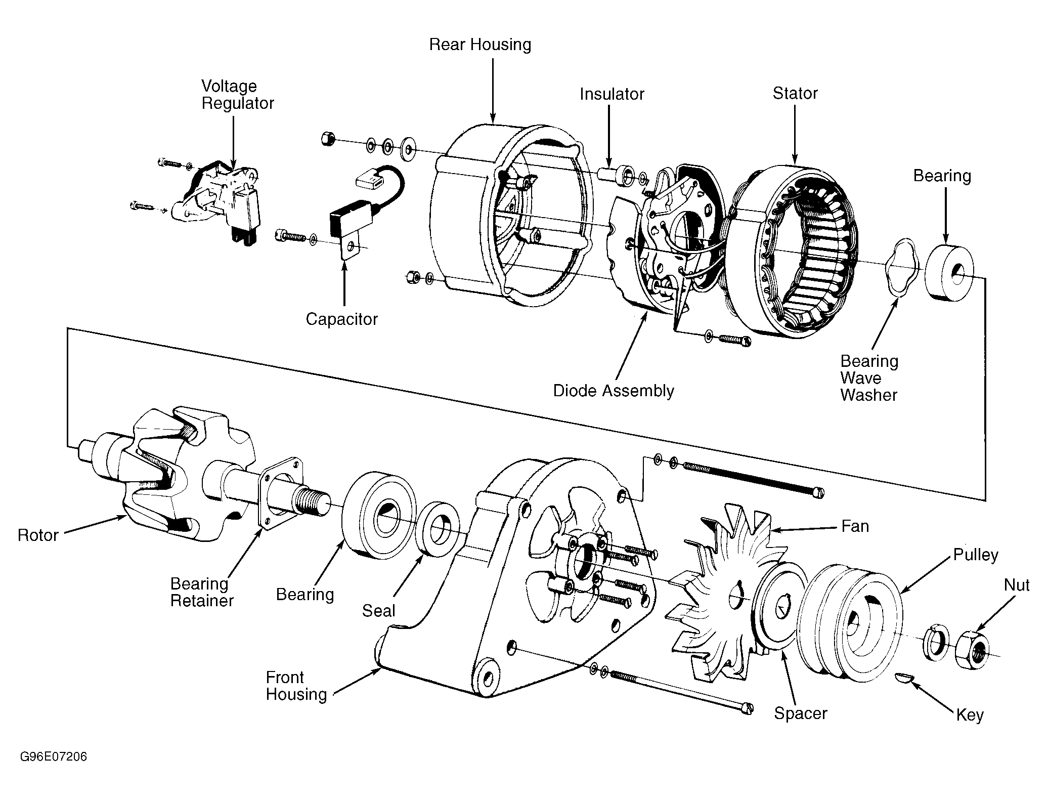 All models are equipped with Bosch 3-phase, self-rectifying, 90-amp, 110-amp, or 120-amp generator. See Figure . This internally-regulated generator is equipped with 14 diodes, with 3 exciter diodes connected to stator windings. These 3 diodes turn off the generator indicator light and supply power to the voltage regulator while the engine is running.