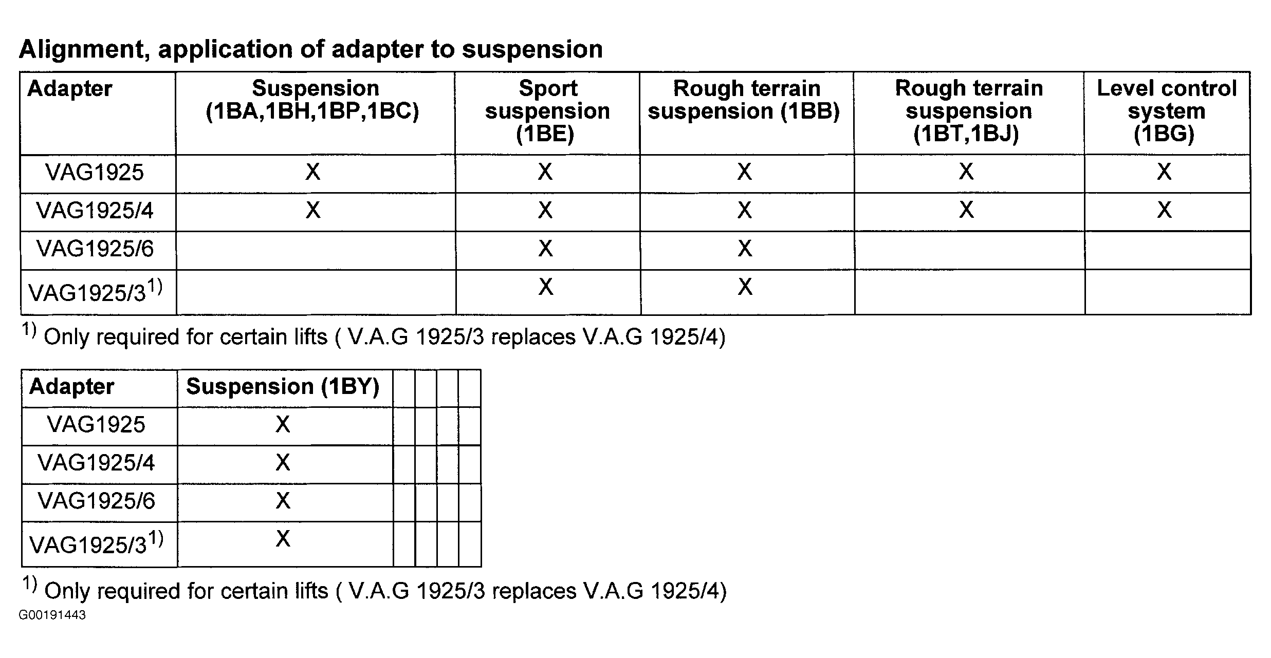 Different adapters are needed for lifting, depending on suspension variation. To identify application of suspension and adapter, see Fig 1 . To identify adapter, see SPECIAL TOOLS . To prepare vehicle for checking toe-in curve adjustment, place vehicle in initial position by performing appropriate procedure.