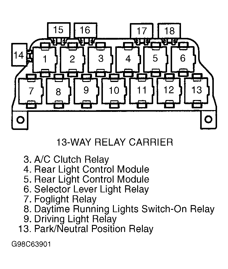 | Rear Light Control Module | On 13-pin relay carrier, position No. 4 & No. 5. See Figure. |