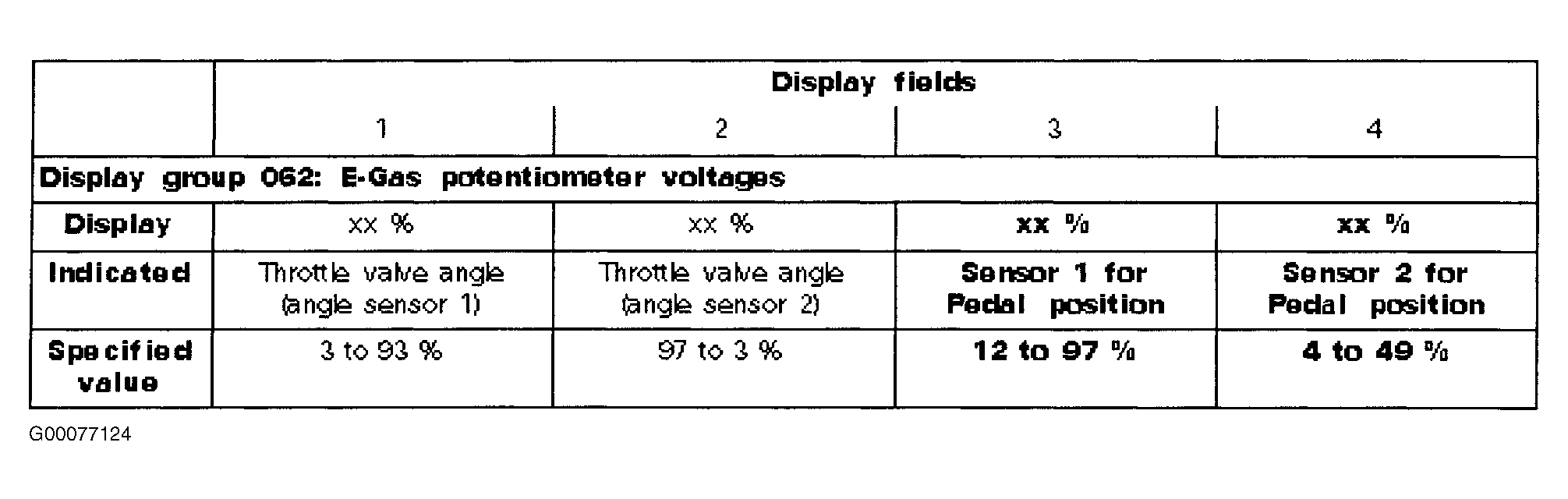 - Using scan tool, enter display group MAX. INPUT VALUE = 255. From button field 2 select function 062 for DISPLAY GROUP NUMBER 062. Press "Q" button to confirm input. Observe specified values for E-gas potentiometer voltages in display fields 3 and 4. See Fig 1. If displayed values are not as specified, go to next step. If displayed values are as specified, go to step 7.