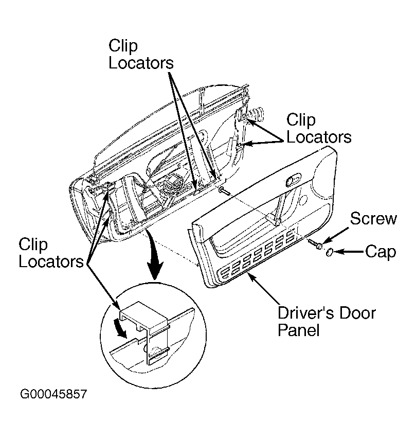 - To install reverse removal procedure. Lubricate window regulator seal with soap. All clip locators must be clipped in place before installing door trim. When installing door handle cable, make sure hook is facing upward.