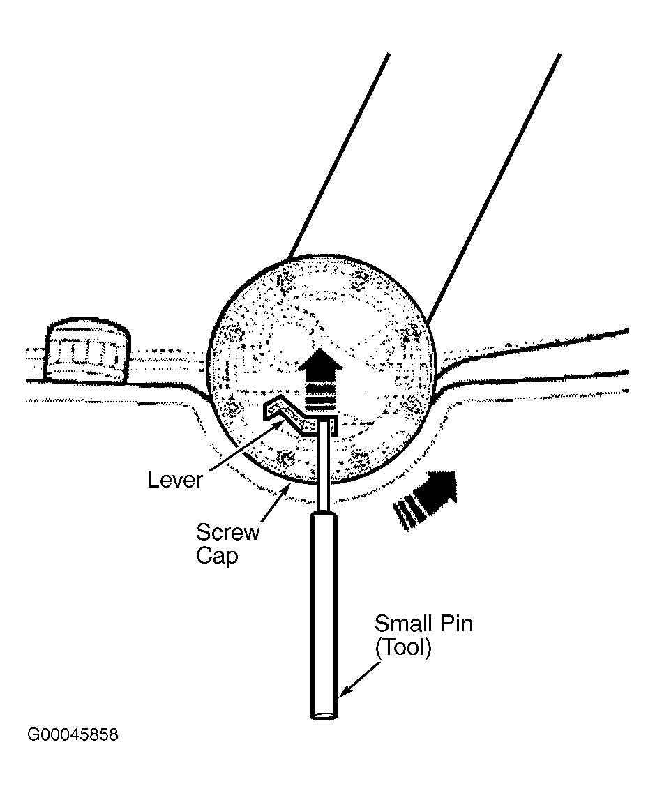 - Remove screw cap from middle of door panel by inserting a small pin through hole on bottom of switch trim. Press pin and lug slightly up and at same time turn screw cap counterclockwise and remove cap. Remove screw under cap. See Fig 2