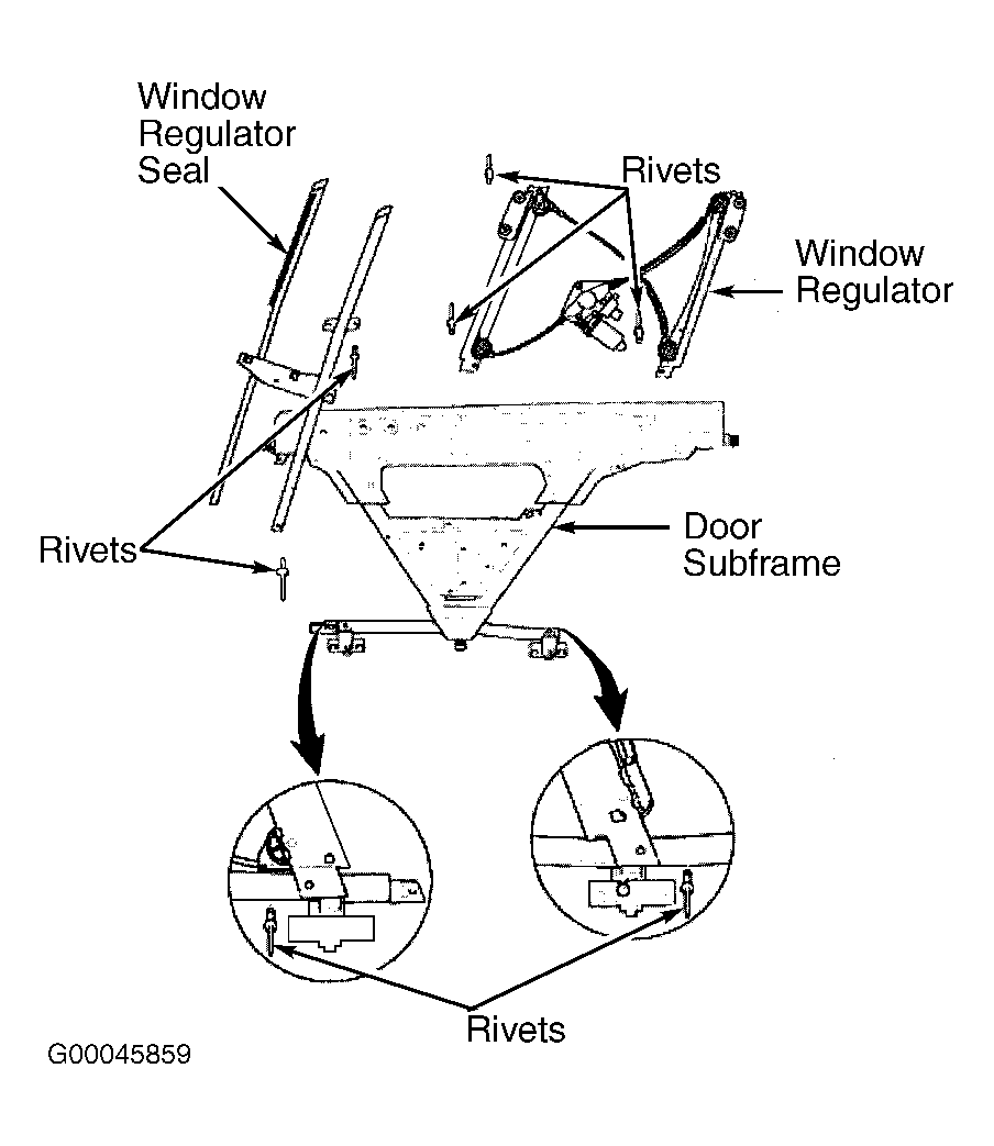 . Drill out 7 rivets from window regulator and remove window regulator.