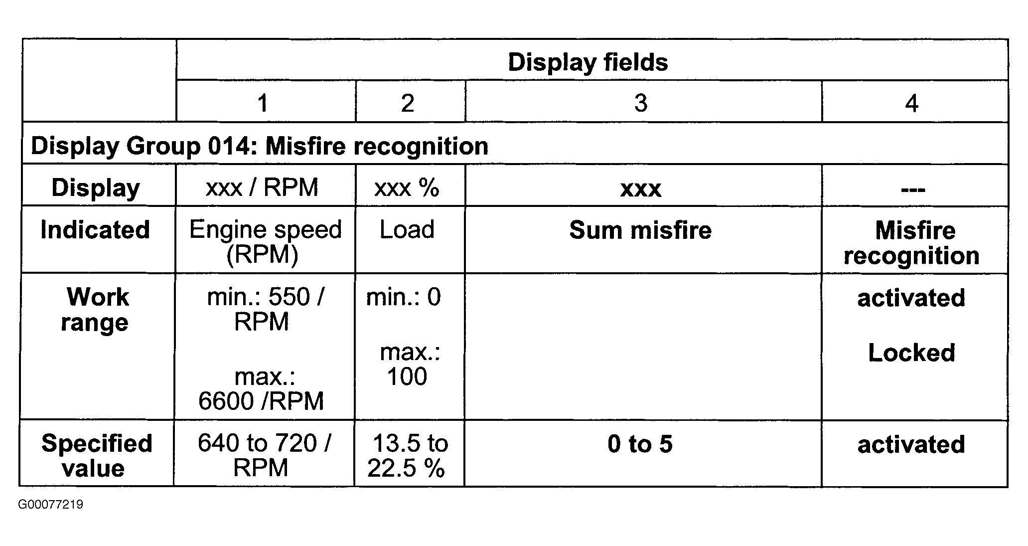 - On scan tool, press "014" to select DISPLAY GROUP 014. Observe misfire recognition in display field No. 3. See Fig 1