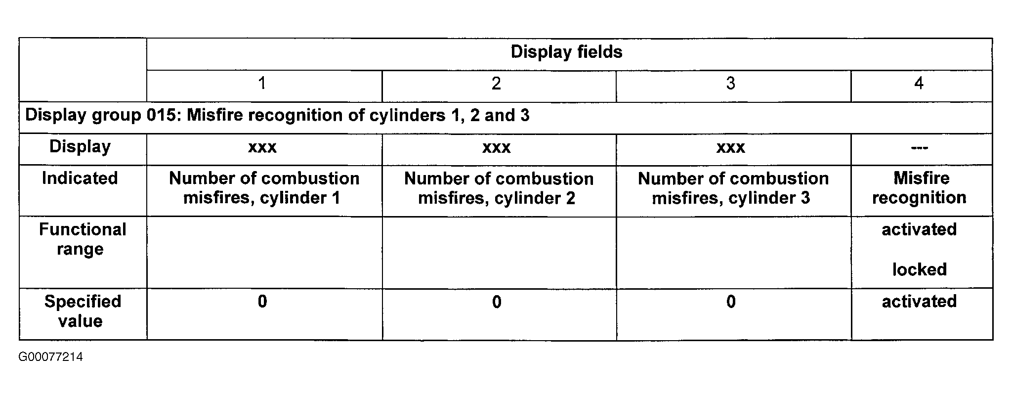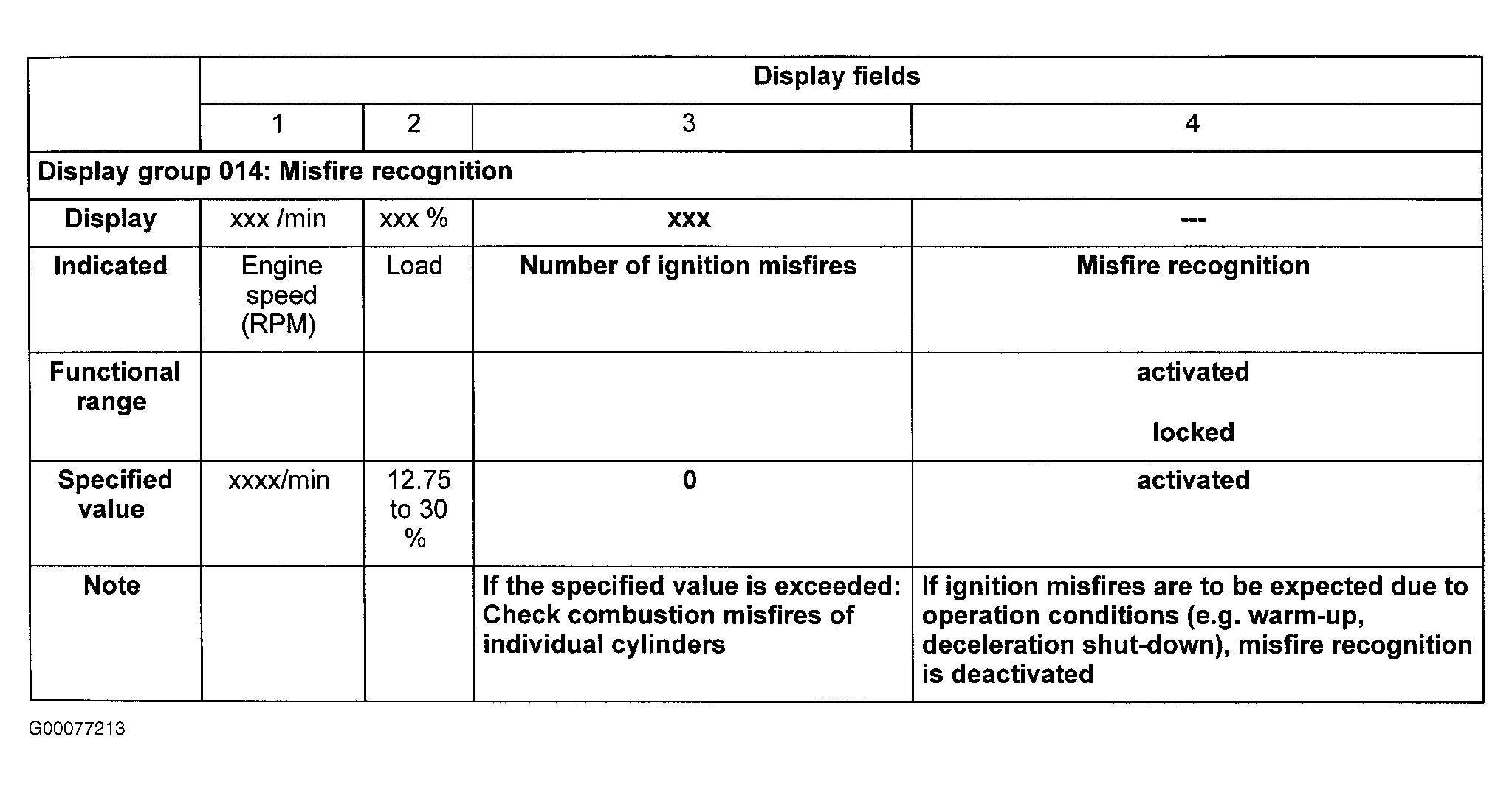 - On scan tool, press "014" to select DISPLAY GROUP 014. Observe misfire recognition in display field No. 3. See Fig 1