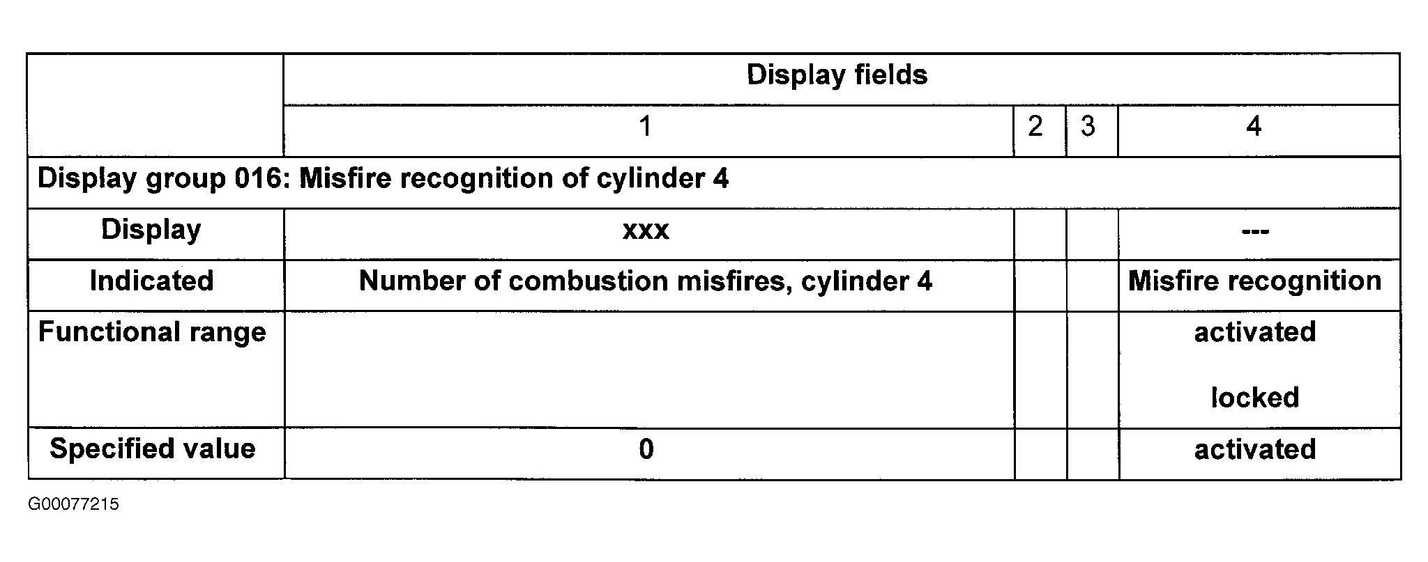 - On scan tool press "UP ARROW" or enter "016" to select DISPLAY GROUP 016. Observe misfire recognition in display field No. 1. See Fig 3
