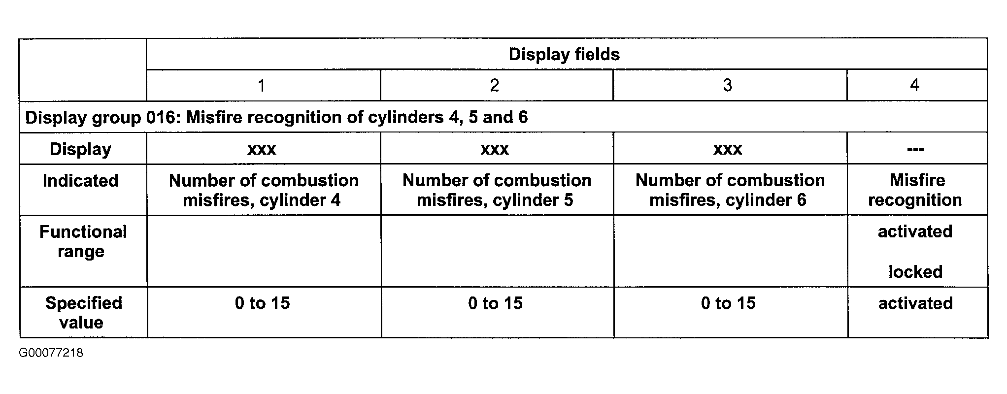 - On scan tool press "FORWARD ARROW" or enter "016" to select DISPLAY GROUP 016. Observe misfire recognition in display fields No. 1, 2 and 3. See Fig 3