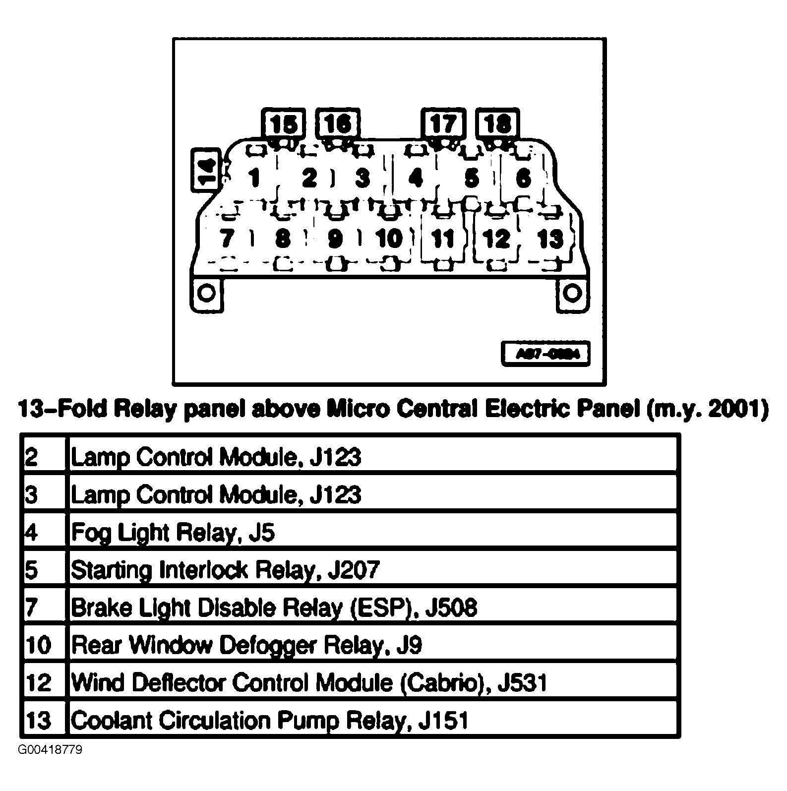 | Wind Deflector Control Module (Cabrio) | In 13 fold relay panel. See Figure . |