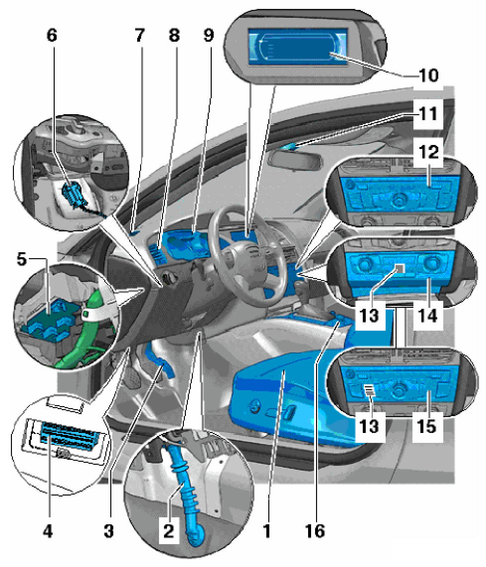 | Air Bag Control Module (12) | Below center console. See Figure. |