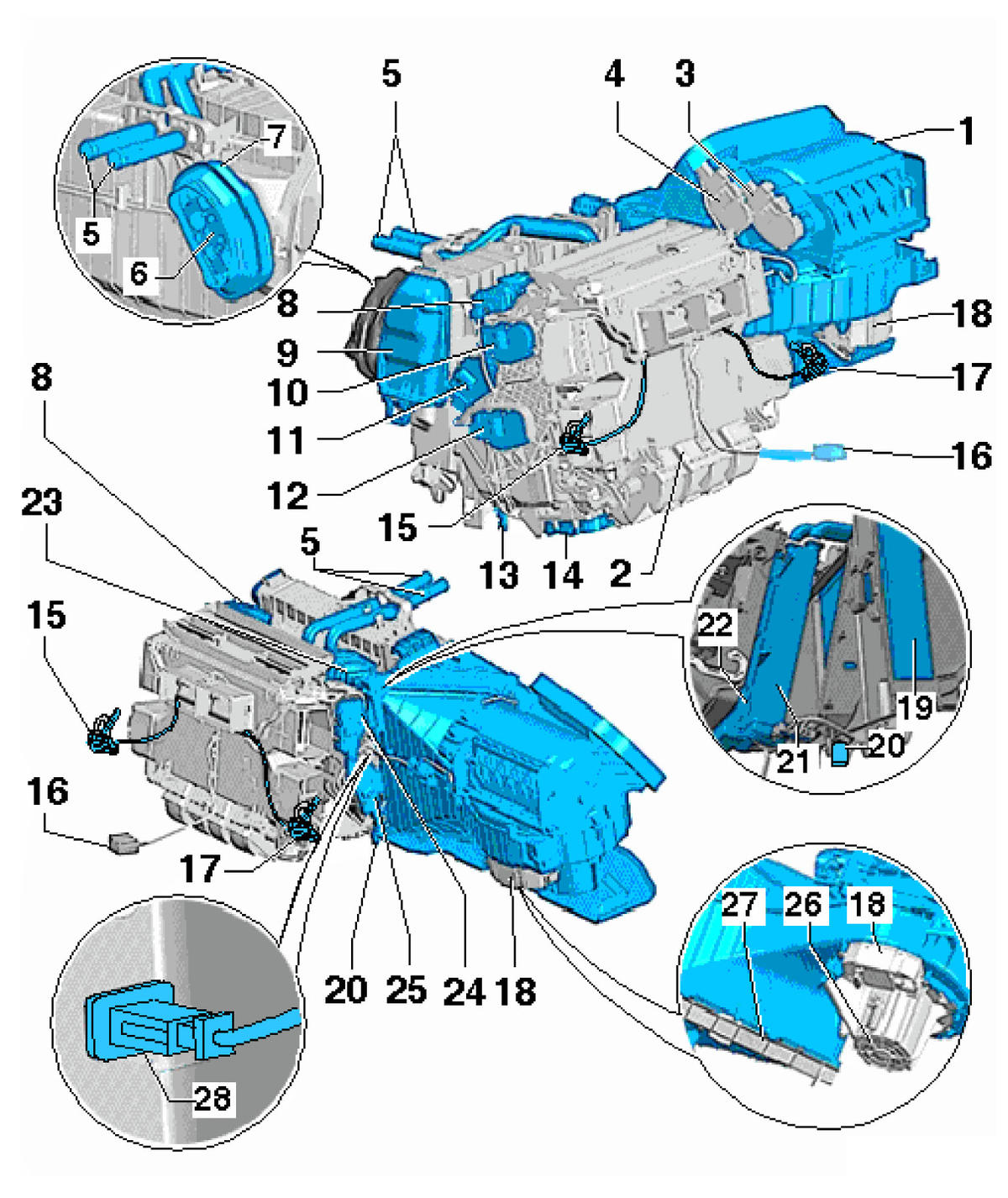| Fresh Air Blower Control Module (18) | Lower right side of air intake housing. See Figure. |
