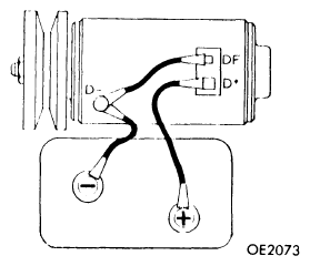 - Connect lead from negative battery post to D- terminal on generator (see Fig 1). Momentarily contact lead from positive battery post to D + terminal on generator. Generator is now polarized and ready for testing.