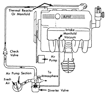 The air injection system is used to reduce hydrocarbon (HC) and carbon monoxide (CO) emissions. The system adds a controlled amount of fresh air to exhaust gases at the exhaust ports causing oxidation of gases. On all models except Federal 320i, air injection is used in conjunction with a thermal reactor. See Fig 1. The air injection system consists of a belt-driven air pump, a diverter valve, a check valve, electromagnetic switch (Blue), speed relay switch (also used by EGR system), and various connecting hoses and pipes.
