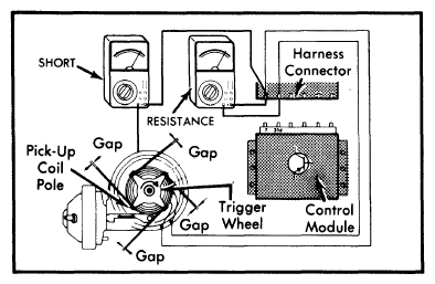 Turn ignition switch "OFF". Disconnect connector from control module and attach ohmmeter leads (set in x100 scale) to terminals 7 and 31d of harness connector. See Fig 1. Measure pick-up coil resistance. If not to specifications, remove electrical connections at distributor and connect ohmmeter leads directly to pick-up coil terminals. If still not to specifications, replace pick-up coil assembly.
