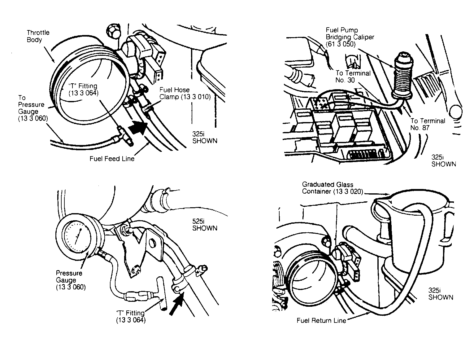 - On 318 Series, 325 Series and 525i, remove air intake duct to gain access to fuel lines near throttle body. On all models, connect Pressure Gauge (13-3-060) and "T" Fitting (13-3-064) in fuel lines in front of fuel pressure regulator. See Fig 1 . Block (plug) fuel return line with Fuel Hose Clamp (13-3-010).