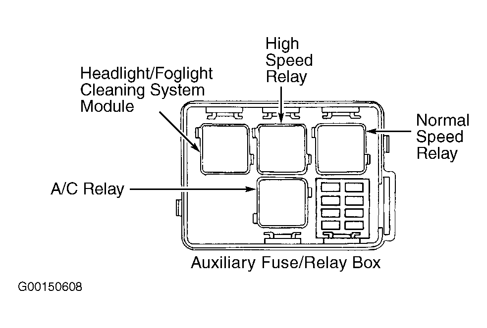 Headlight/Foglight Cleaning System Module On left side of engine compartment, in auxiliary fuse/relay box. See Figure .