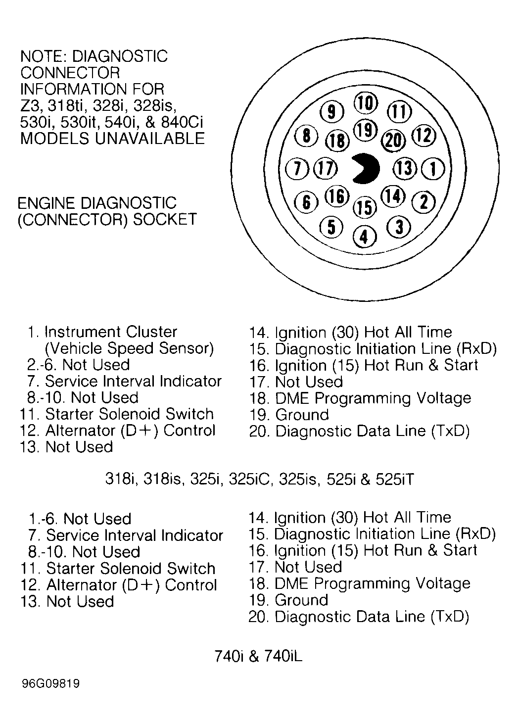 Data exchange between control unit and BMW diagnostic software occurs via Diagnostic Initiation Line (RxD) and Diagnostic Data Line (TxD) in engine diagnostic (connector) socket. See Fig 1 .