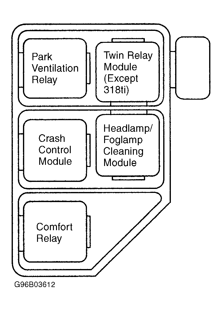 | Twin Relay Module (Except 318ti) | On relay panel, under left side of dash. See Figure . |