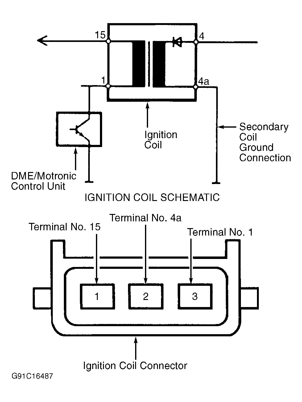 Measure primary coil resistance between terminal No. 1 and terminal No. 15. See Fig 1. Secondary coil resistance cannot be measured. See IGNITION COIL RESISTANCE table.