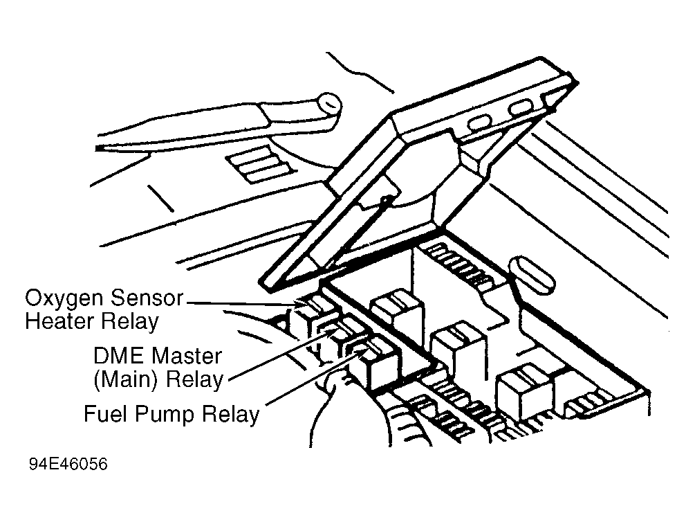 (2) First relay (viewed from left to right) after ground wire is fuel pump relay followed by Digital Motor Electronics (DME) master relay.