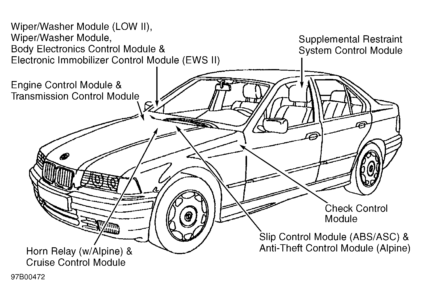 | Electronic Immobilizer Control Module (EWS II) | Under right side of dash, behind glove compartment. See Figure . |