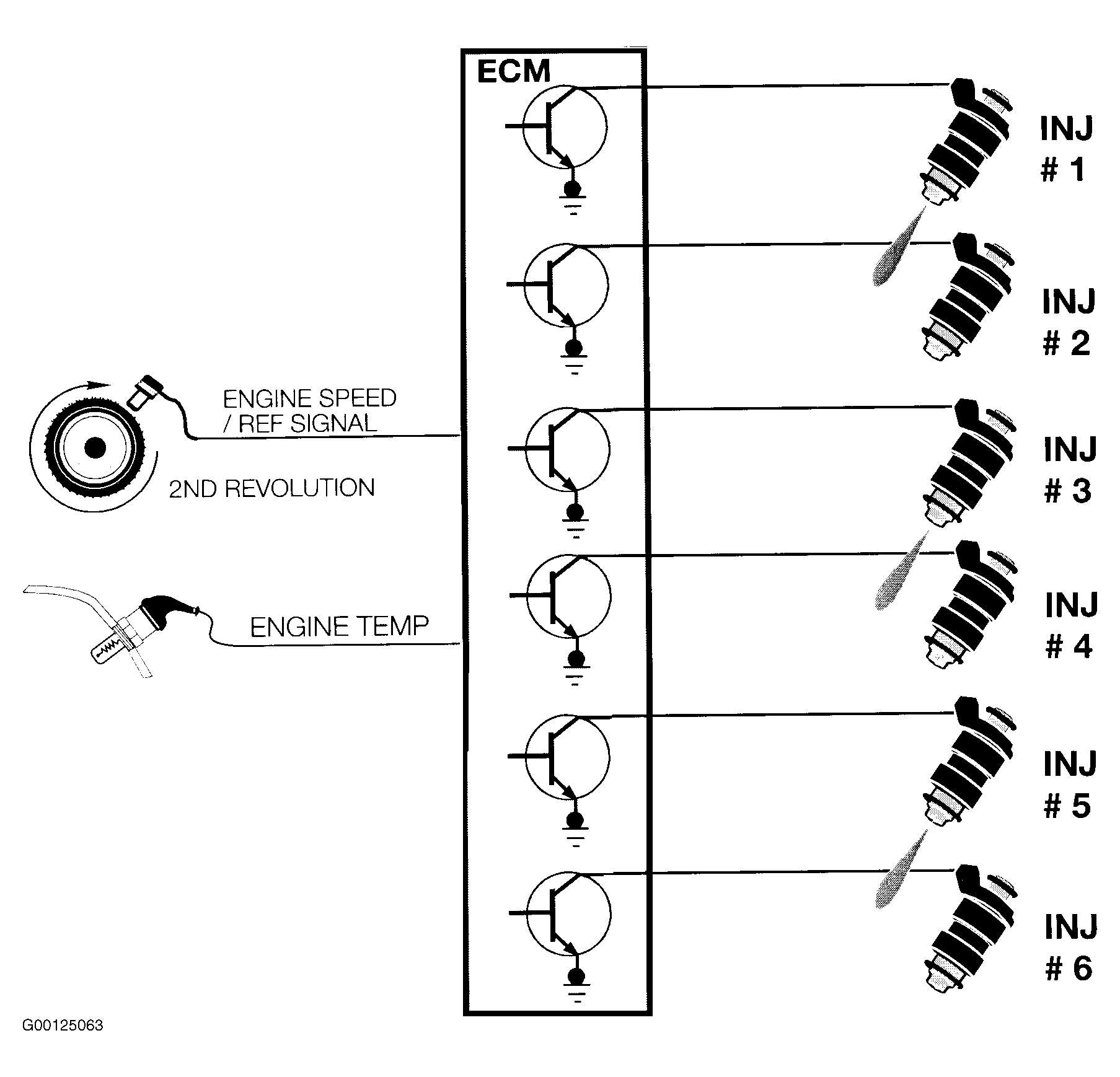 During the start phase, fuel is injected several times for each cylinder group per crankshaft revolution. The quantity of fuel is adjusted depending on engine temperature and engine speed. In addition, the injection timing is retarded at higher engine temperatures and at slower engine cranking speeds. For example, on 12-cylinder engine, after the engine has started (as of approximately 600 RPM), fuel is injected only once per revolution of the crankshaft and cylinder group. See Fig 1. This means that during the first crankshaft revolution fuel is injected into cylinders No. 2, 4 and 6 simultaneously and during the second revolution into cylinders No. 1, 3 and 5. Cylinders No. 8, 10 and 12, and No. 7, 9 and 11 are supplied with fuel in the same way but offset by 60 degree crank angle.