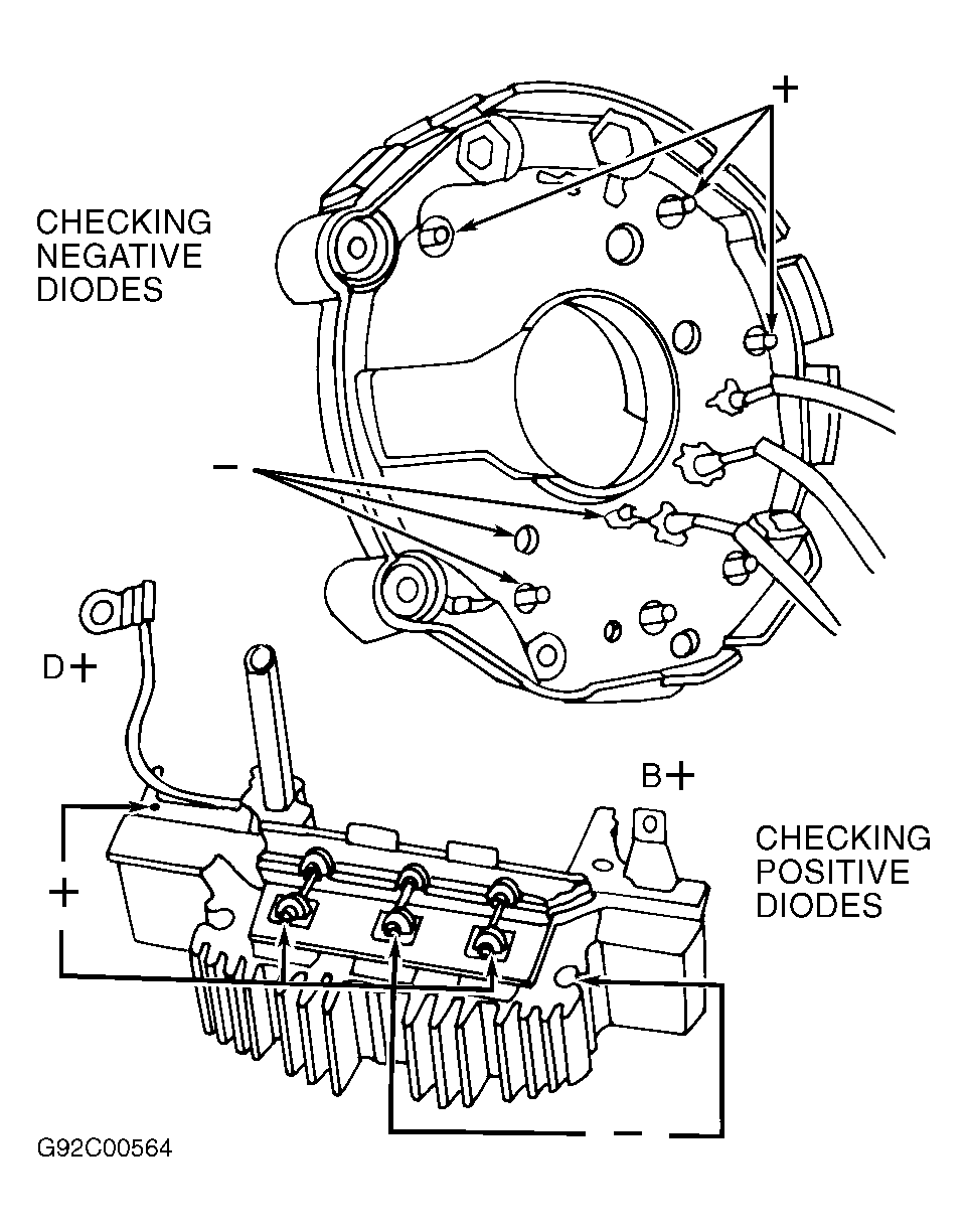 - Connect DVOM leads, in turn, between D+ terminal and each stator terminal. Reverse leads. DVOM should indicate continuity in one direction only. Replace diode assembly if continuity is not as specified.