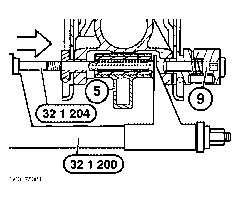 - Press clamping fixture (9) out of adjusting lever (5) with special tool (32 1 200) and insert (32 1 204). Grip drive of special tool with open-end wrench. See Fig 7.
