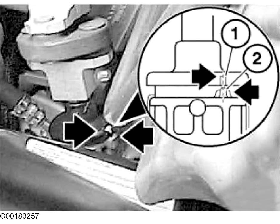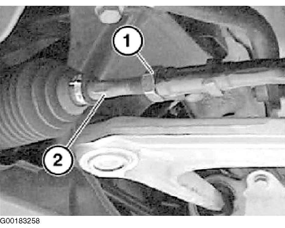 - Slacken clamping nut (1) on steering tie rod. Adjust wheel toe-in by turning tie rod at hexagon head (2). See Fig 2. For specification, see E46 under WHEEL ALIGNMENT SPECIFICATIONS.