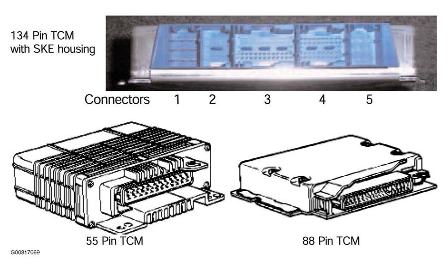 The 134 Pin TCM is also referred to as SKE (Standard Shell Construction). The SKE housing uses 5 separate connectors. On transmission applications only three connectors 1, 3 and 4) are used. Connectors 2 and 5 are blank and are NOT used. The connectors are blue in color to avoid confusion with the ECM (DME) connectors which are black. See Fig 2 .